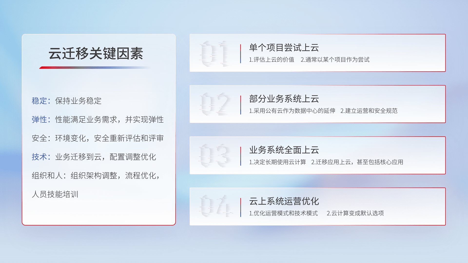 结合实际业务,,从规划设计、、云平台选型、、云原生改造、、、数据迁移、、集成交付,,迁移全过程为客户识别最佳上云路径,,,,做好风险识别管理,,,设计网络架构、、、、身份权限、、、、安全审计合规、、、、操作审计、、、、日志审计、、、、监控告警策略、、、、多站点容灾设计等,,对云上基础设施进行整体规划,,,提升IT治理水平,,以满足弹性、、、高可用、、、、高性能的需求。。。。