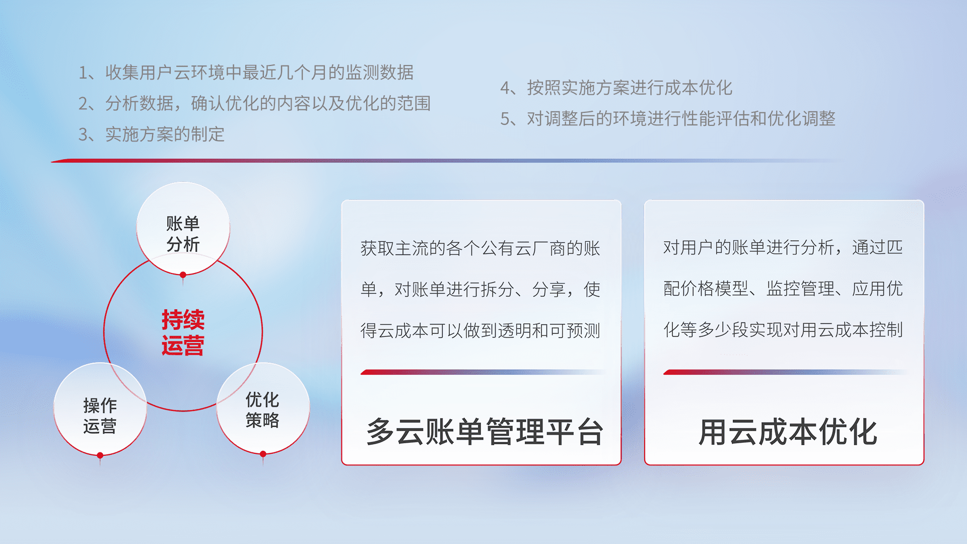 通过多云纳管,,,,以统一的资源数据模型把客户的云资源进行抽象和封装,,进而实现对多云资源的统一操作,,,,保障云资源管理的可靠性、、稳定性与可用性。。量身定制化运维内容,,配置、、、、开发运维、、、、补丁管理、、、备份、、监控、、认证和访问管理、、审计和日常巡检等,,保障在用云过程中的可靠度,,,稳定度以及高可用率。。。。